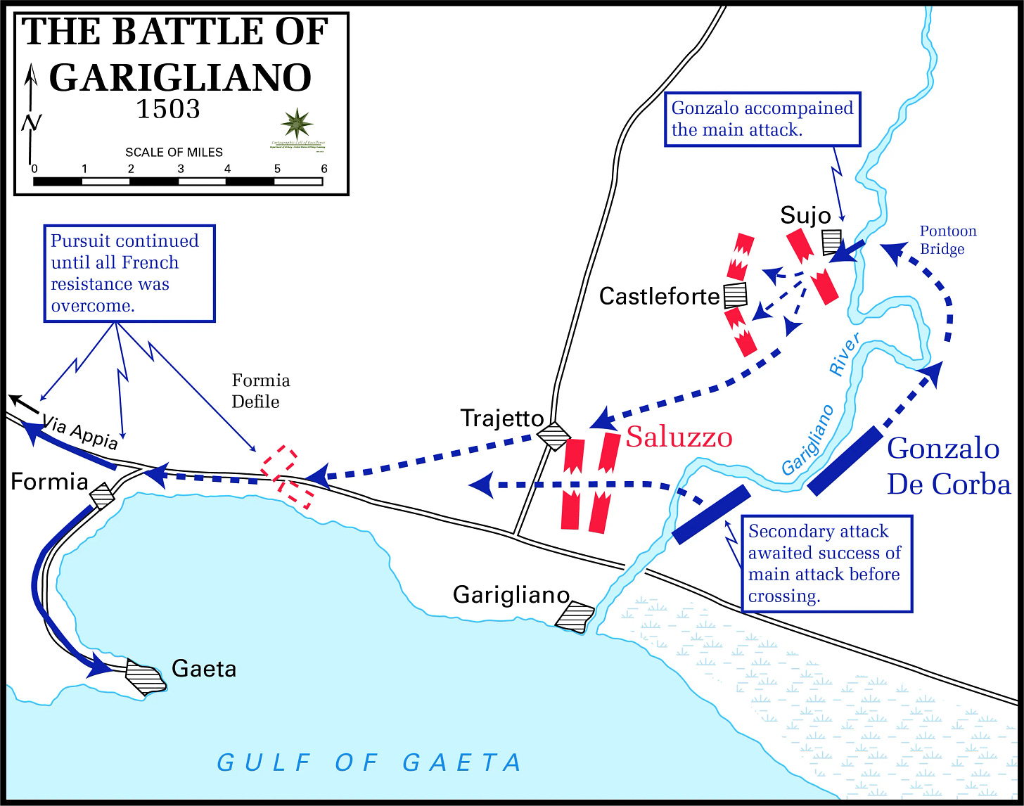 Gonzalo was meanwhile gaining strength. The Spanish ambassador in Rome contracted a large contingent of Italian mercenaries under the condottiere Bartolomeo d’Alviano, who arrived at the Spanish camp in December. This gave Gonzalo more infantry than his enemy, even if he remained weaker in cavalry, lending him the confidence to go on the offensive. Leaving a body of troops to mask the bridgehead, he constructed a bridge of his own about 8 km upstream and crossed on the 28th, rapidly sweeping aside their pickets and securing a lodgment. The next morning, he struck in force.
