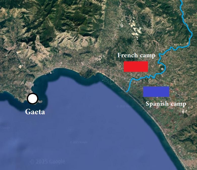 These measures soon paid off when Spanish army came up from Naples to besiege Gaeta. Its commander was Gonzalo de Córdoba, Spain’s foremost general. He had already won a great reputation for completing the Reconquista with his capture Granada, and in subsequent wars in Italy innovated new combined arms which he used to win a stunning victory over the French earlier that year at Cerignola. Gonzalo’s genius could not overcome the strong walls and plentiful artillery of Gaeta, however, and he was soon forced to draw off as the main French army approached in late September.