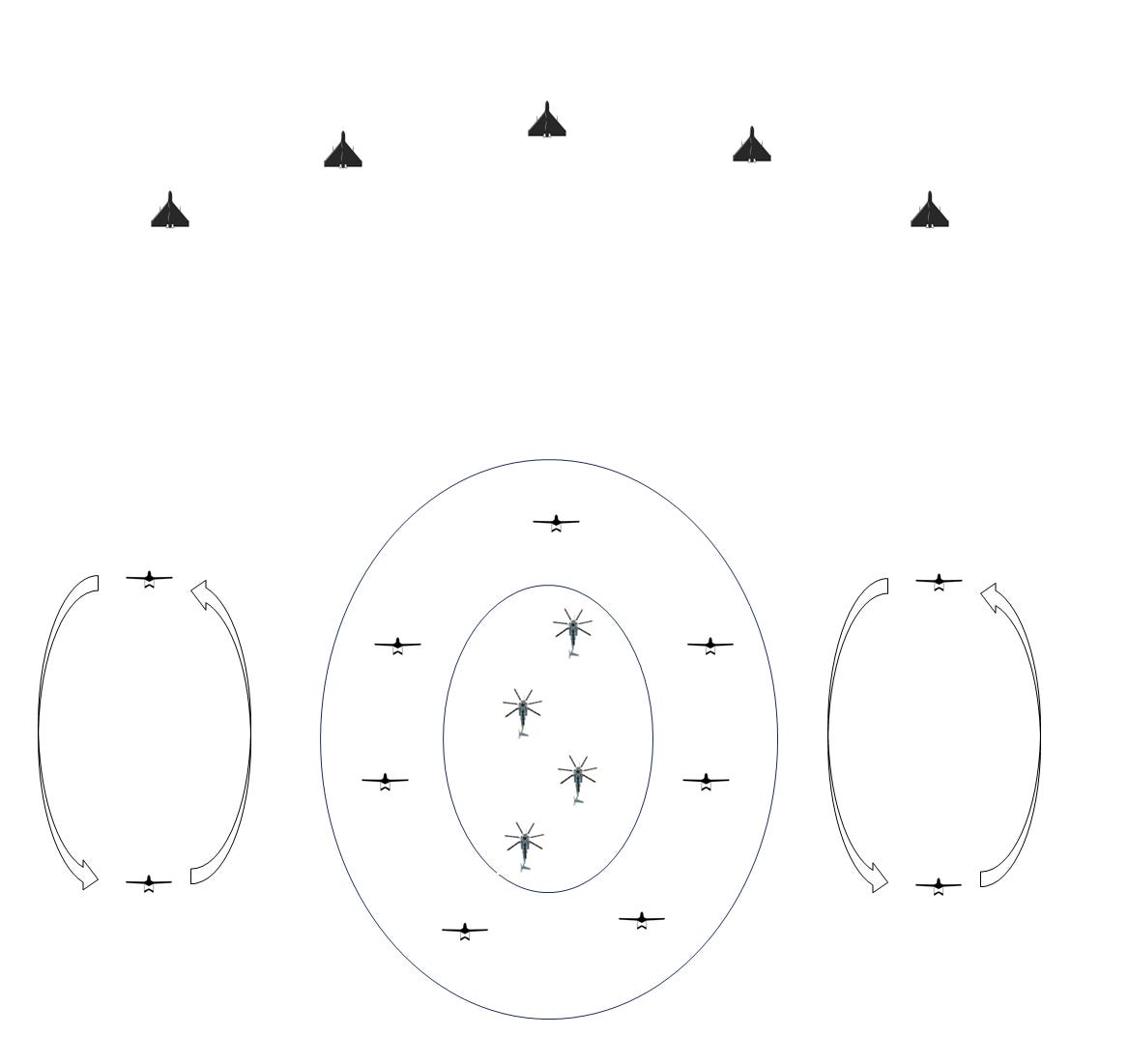 This evolved from Israeli tactics explored in the 1980s, when decoy drones opened the way for manned aviation to attack Syrian ground sites; itself an outgrowth of the manned decoys used by the Wild Weasels over Vietnam. Work is now being done to make these tactics platform-neutral, executable by a flight of same-type drones: whichever one first encounters an enemy system first would engage it with a frontal fixing attack, while the others sweep around to attack from other directions.