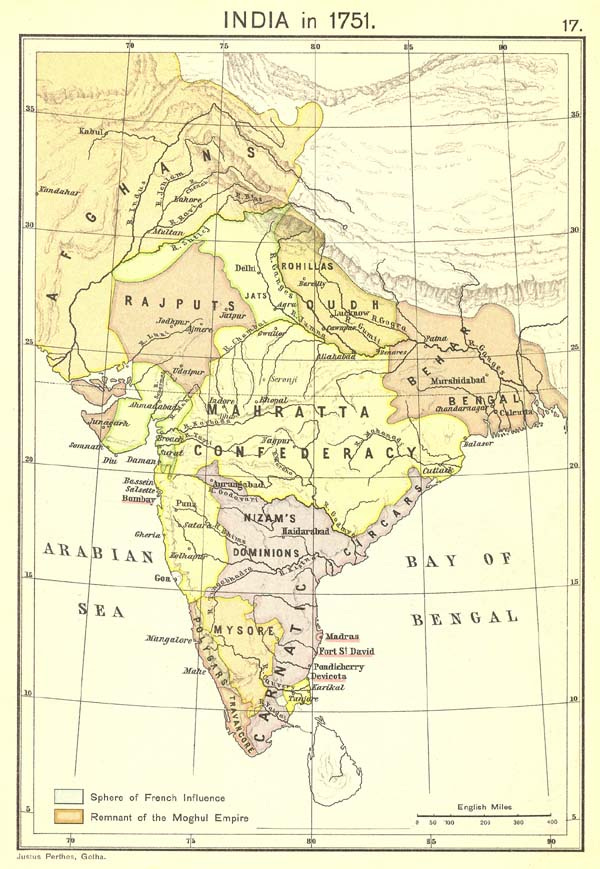 The first was the Maratha state, a Hindu state which had recently fought a long series of wars to maintain its independence from Muslim Mughal rule. The Marathas controlled the west central coast, from around Portuguese Goa in the south up to Gujarat, although in the coming decades they would expand inland and northward at their neighbors’ expense. In northeastern India was Bengal, ruled by semi-autonomous nawabs who maintained close relations to the court in Delhi and continued to pay substantial tribute.
