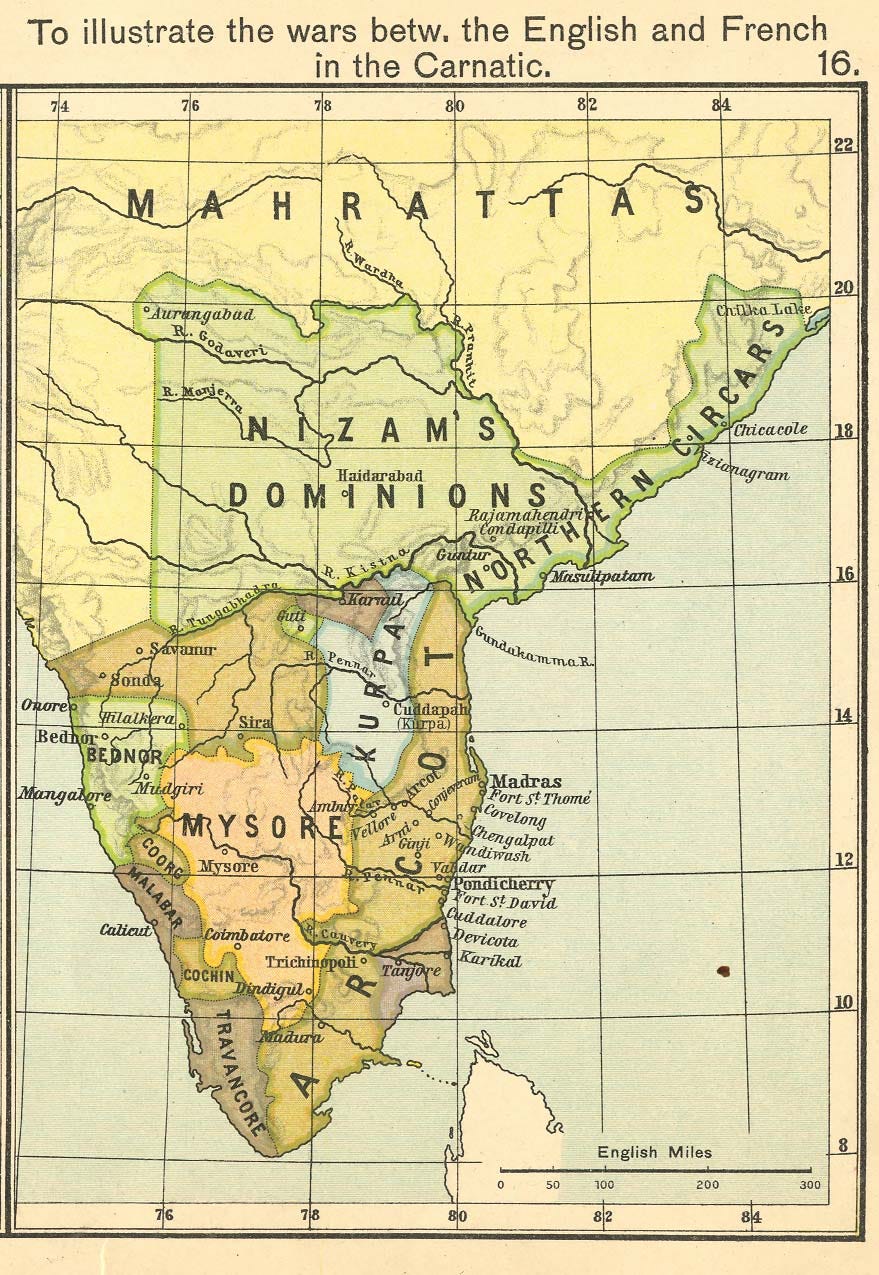 East of the Maratha state in India’s central highlands—the Deccan Plateau—was Hyderabad, ruled by a former provincial governor who adopted the ruling title Nizam. The Nizams of Hyderabad held a status similar to the nawabs of Bengal, but also held intermediate authority over the nawabs of the Carnatic state on the southeastern coastal plain. Finally, south of Hyderabad, occupying the south-central highlands and southwestern coast, was Mysore, another Hindu state that had recently become a tributary to Delhi.