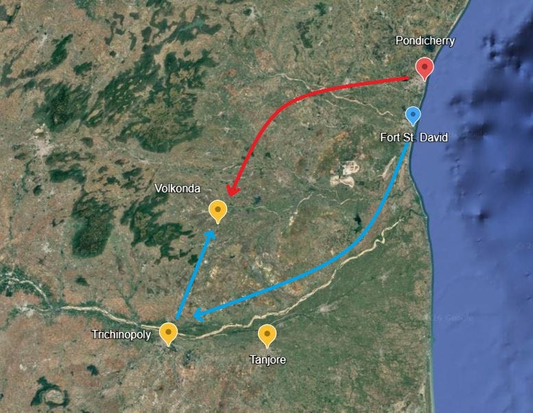 Chanda Sahib’s army arrived before that city a week later. It was soon joined by Jean Law, nephew of the disgraced John Law (who had run France’s finances earlier in the century—it was he who consolidated the various royal monopolies into a single Compagnie des Indes, what we here call the French EIC). Law neveu had previous experience in India—he participated in the successful defense of Pondicherry in 1748—and had just returned from France. Dupleix assigned him to replace the ailing D’Auteuil as commander.