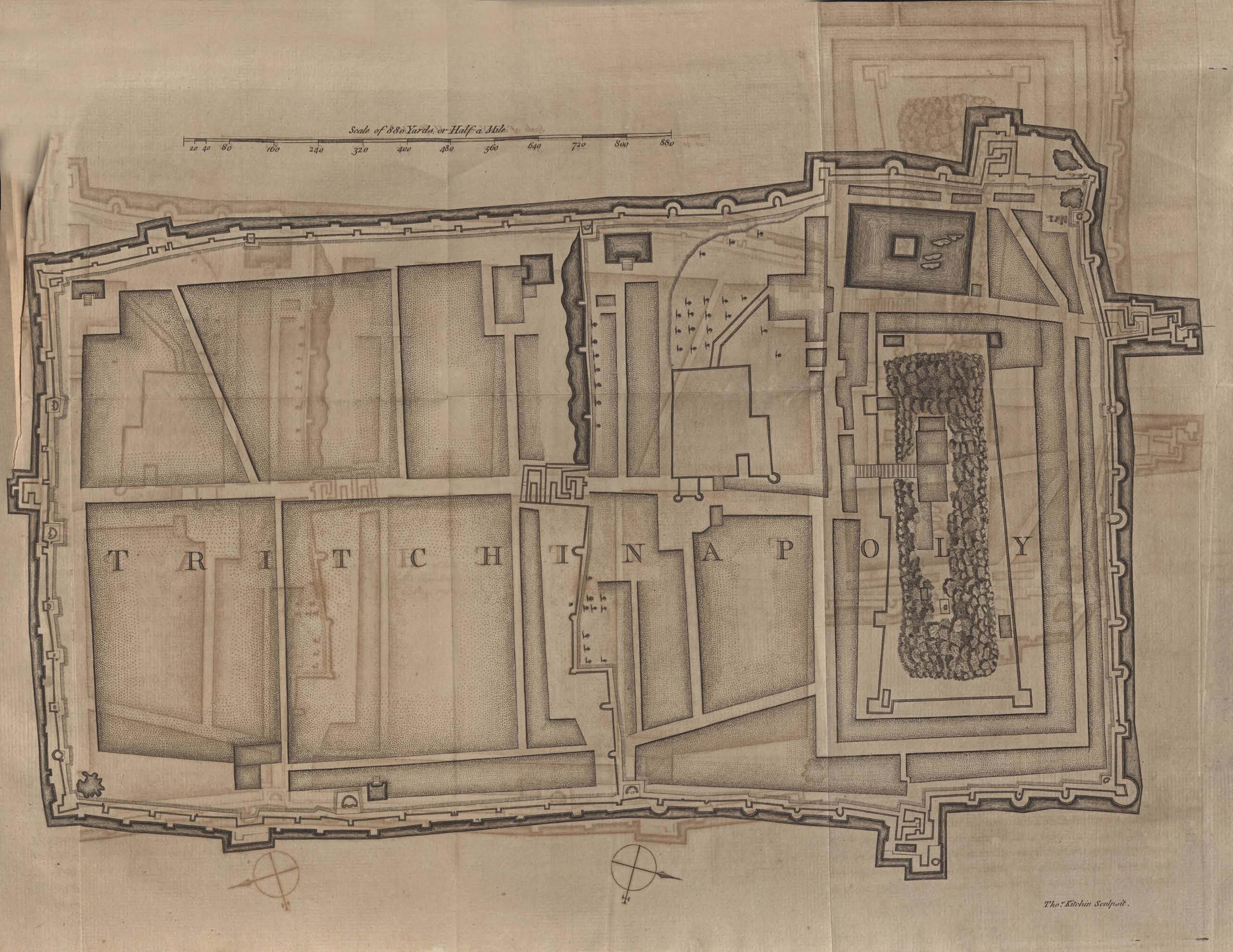 Trichinopoly was an impressive fortress, protected by a double wall roughly 6 km in circumference and a wide moat. The citadel, on a high rock, allowed the defenders to cover the approaches from the river. The allies did not have a large artillery train to batter through these works, but had a great advantage in numbers: Law therefore decided to blockade the place, spreading out through the surrounding countryside to seize its provisions and deny them to the garrison.
