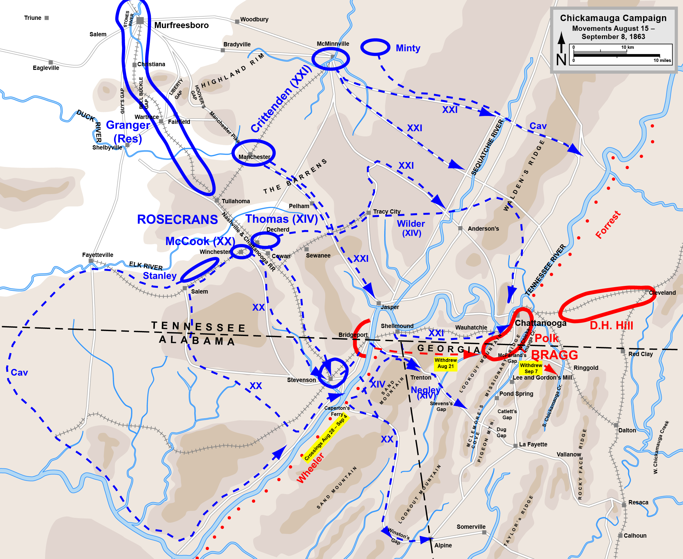 This explains Rosecrans’ failure to destroy Bragg in the subsequent Chickamauga Campaign, in which he pursued the Confederates through the much wider Cumberland Plateau to Chattanooga. Crossing 75 km of mountainous terrain in several columns, he was unable to bag any significant Confederate concentrations and was left scrambling to reconsolidate his army on the far side in the face of a Confederate counterattack. The ensuing Battle of Chickamauga was a bloody Union defeat. Although this was only a tactical defeat, not an operational one—Rosecrans was left holding onto Chattanooga—it precipitated his relief a month later.